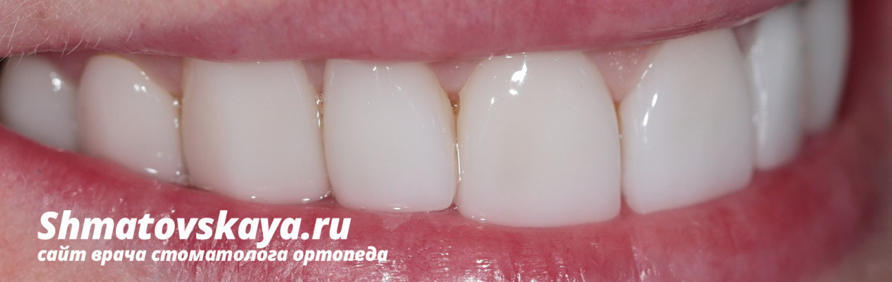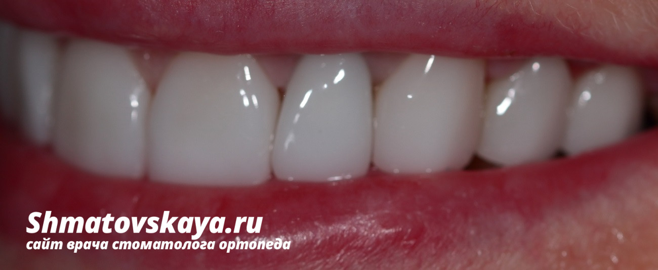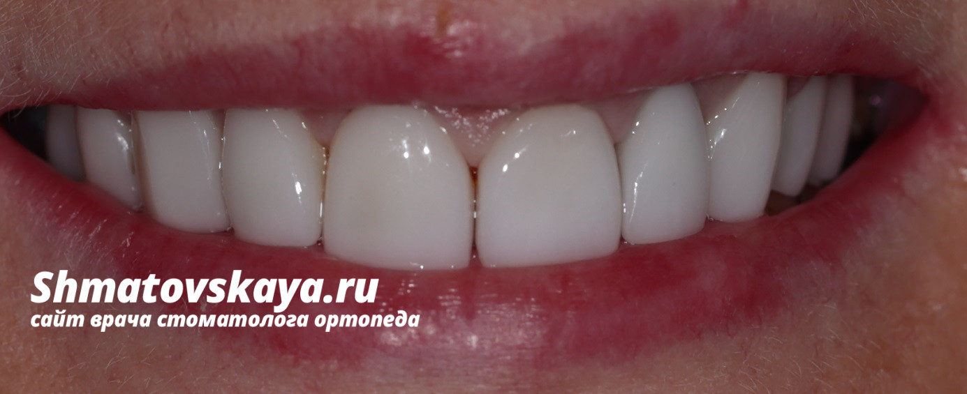 Установлены виниры на 15, 14, 13, 12,11, 21, 23, 24, 25 зубы и прессованная коронк на 22 зуб, цвет виниров выбран согласно пожеланиям пациента, сделана коррекция формы зубов.