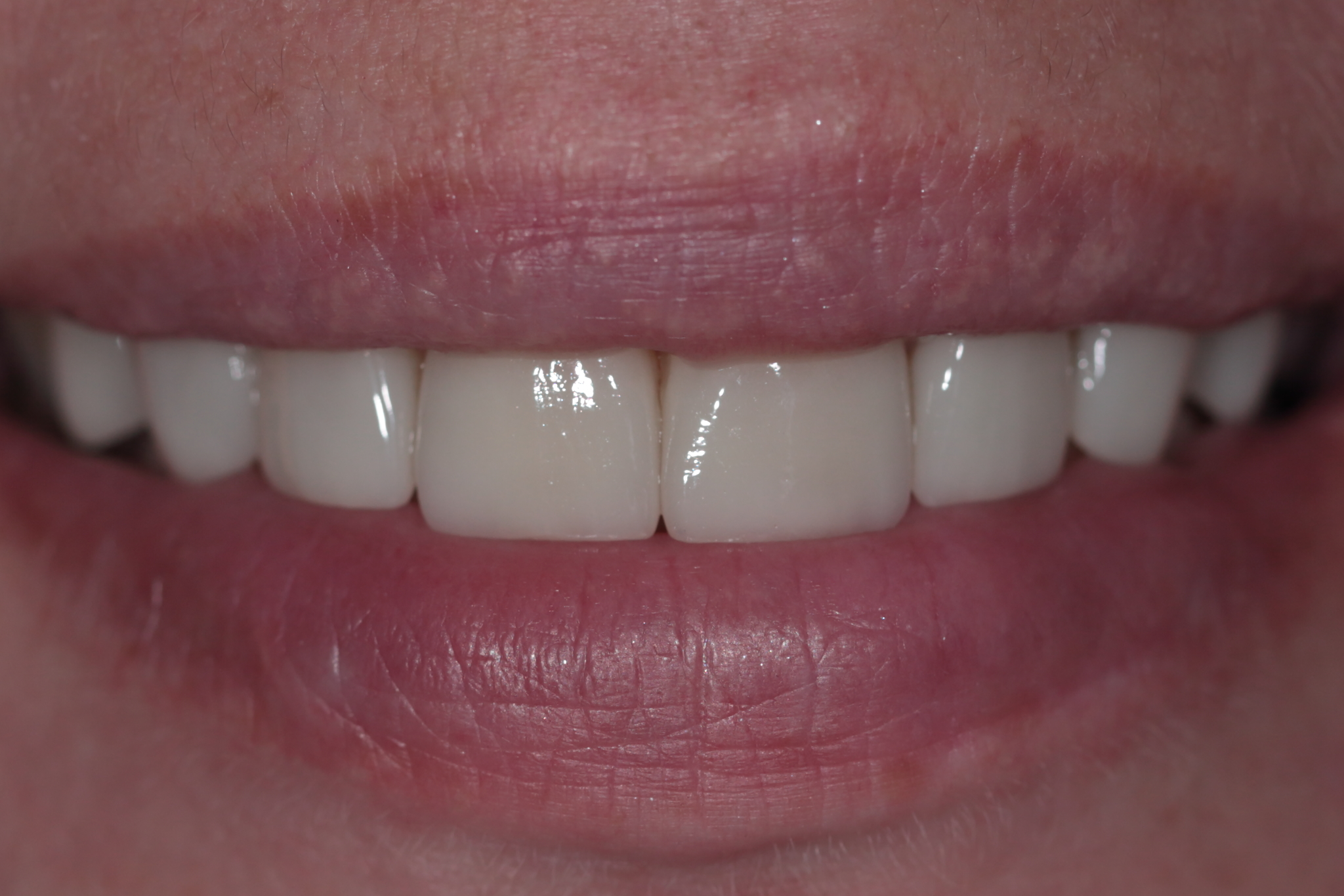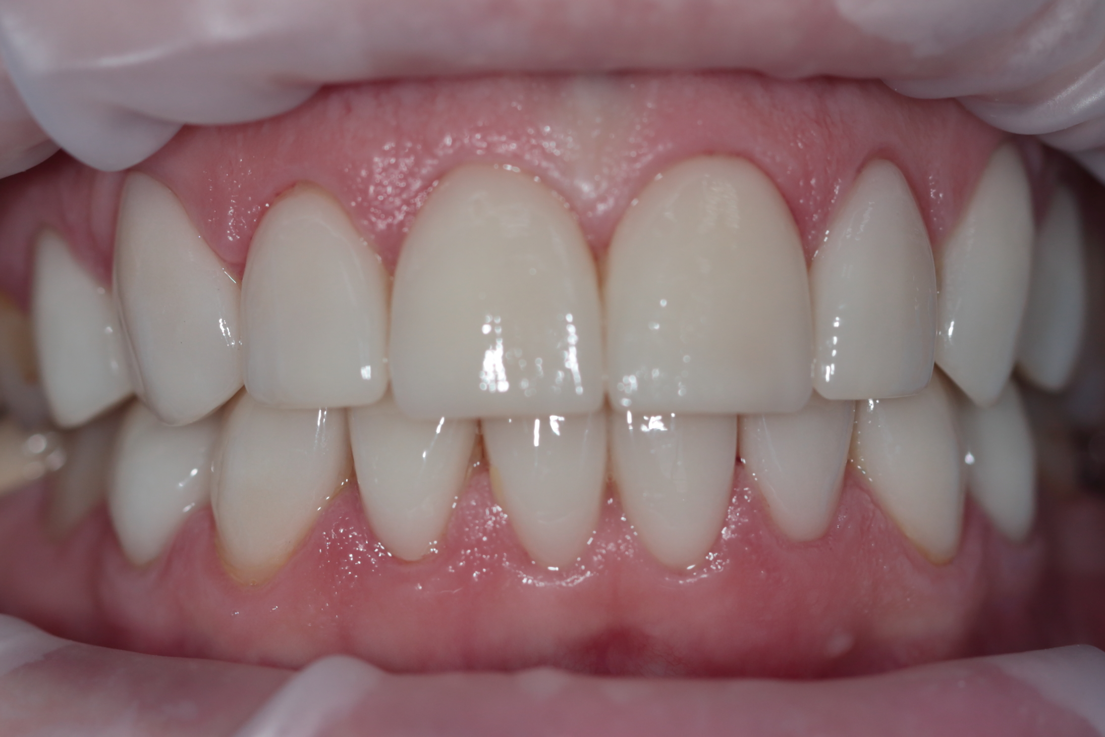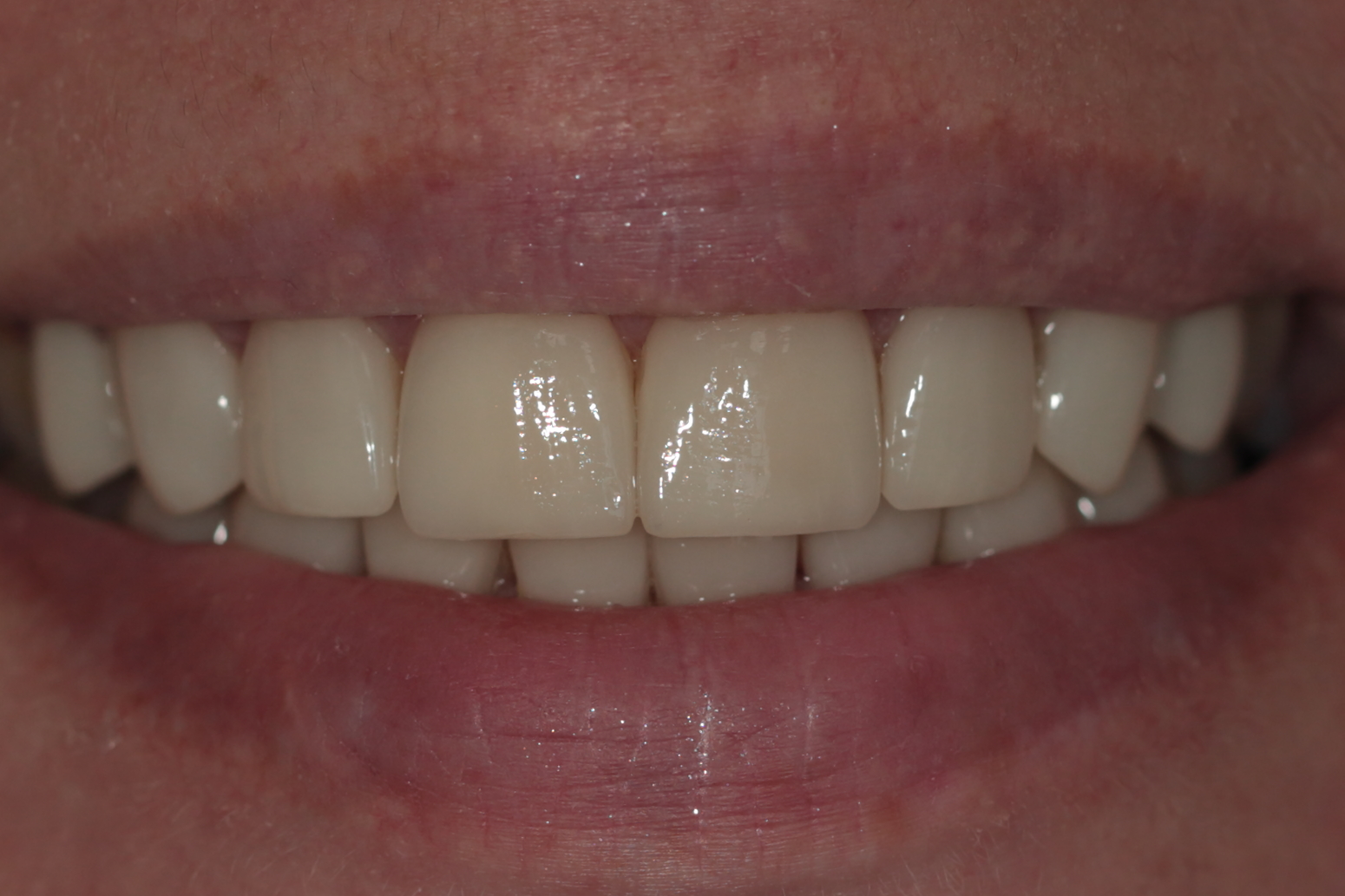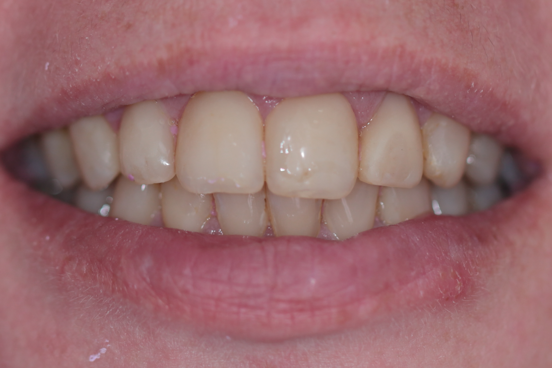 Жалобы пациента: эстетический недостаток центральных зубов, наличие "старых реставраций из пломбировочного материала", темный цвет зубов, нарушение формы зубов.