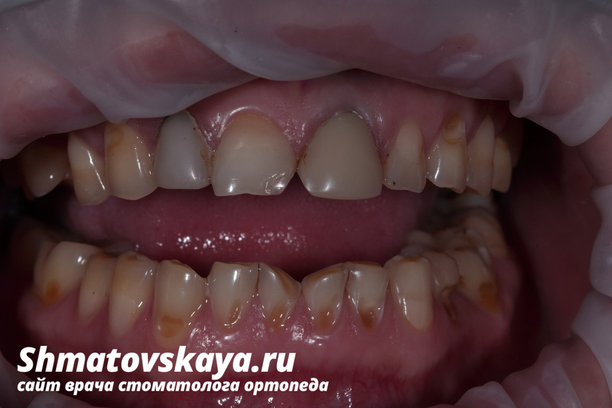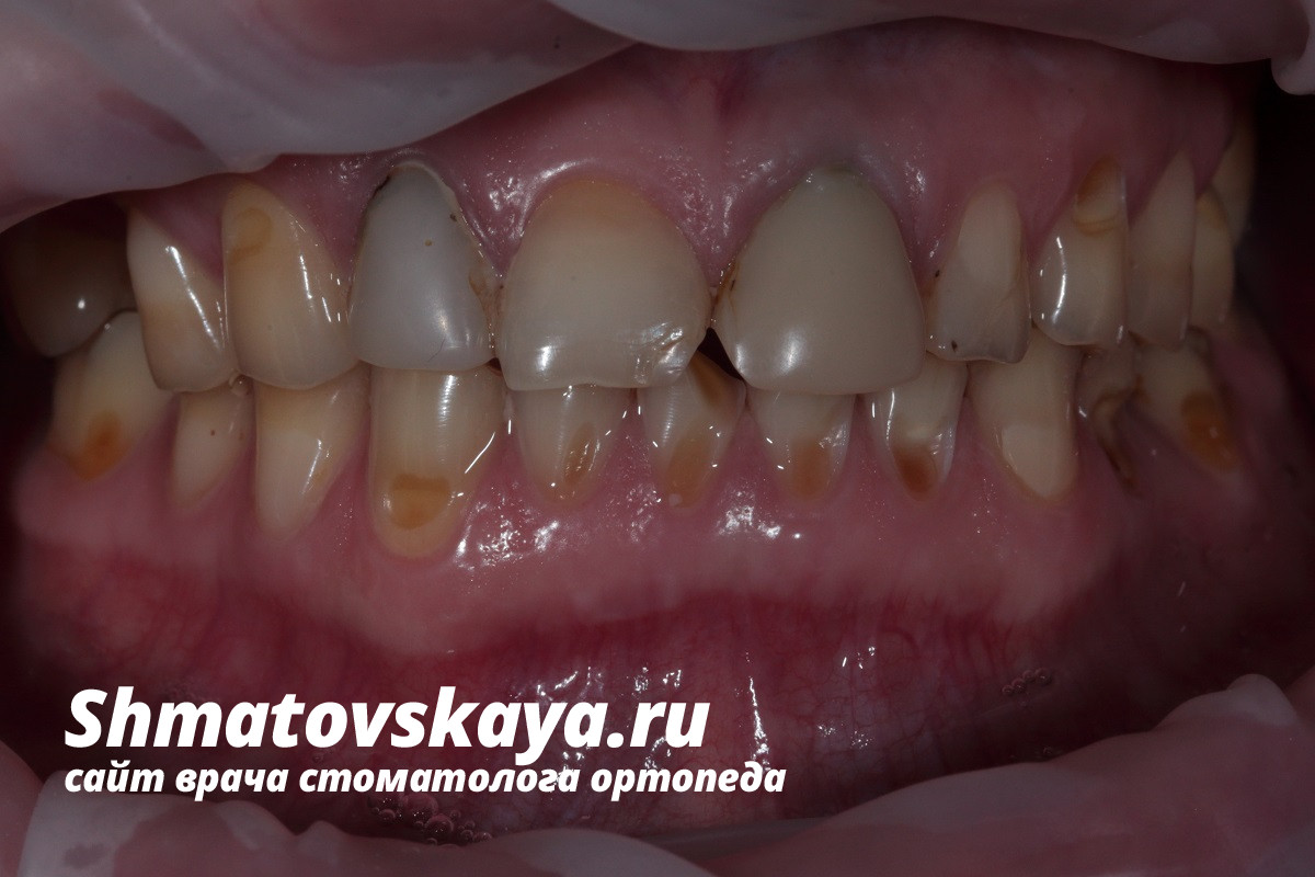 Жалобы: на частые сколы пломб, эстетический недостаток по цвету и форме фронтальной группы зубов, повышенную чувствительность зубов на верхней и нижней челюсти