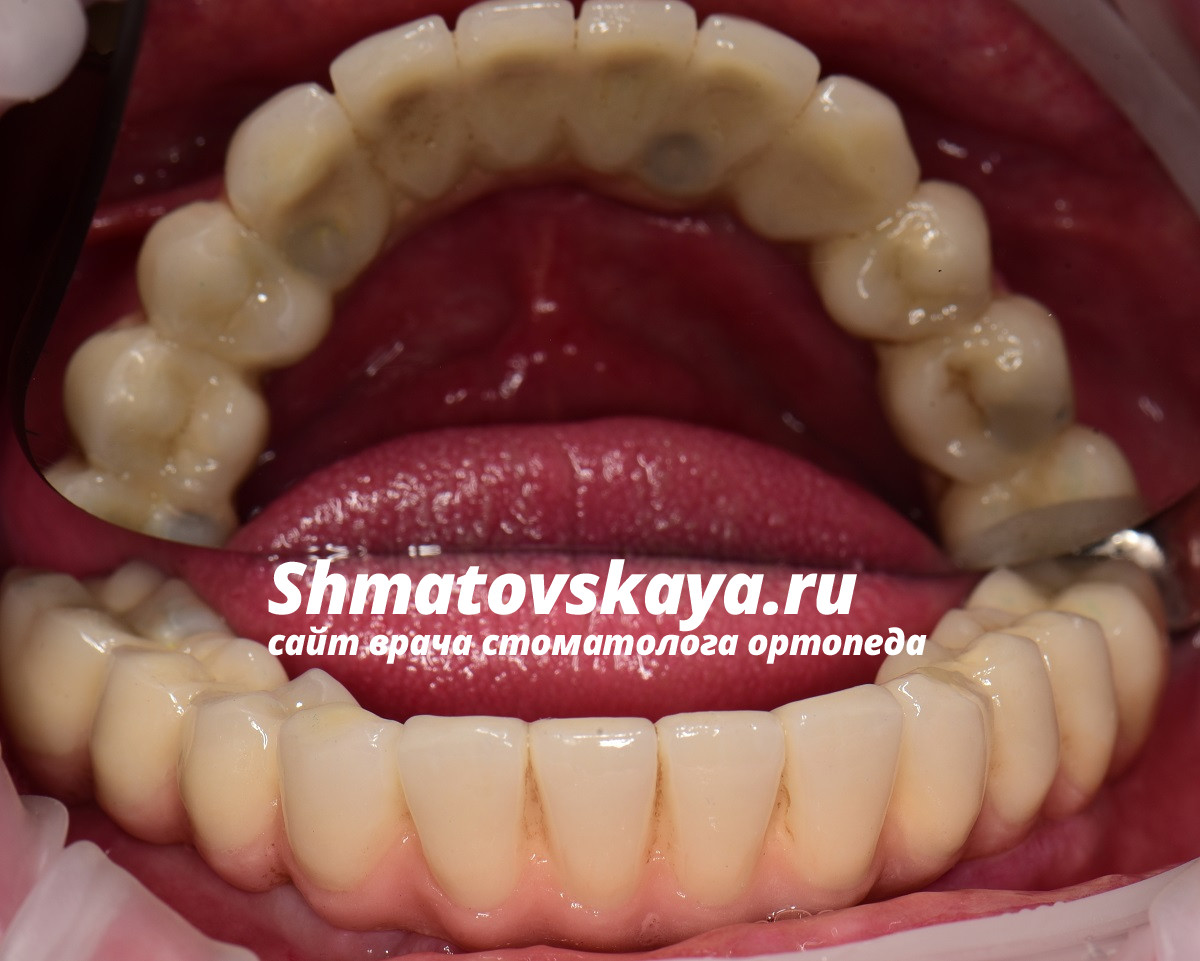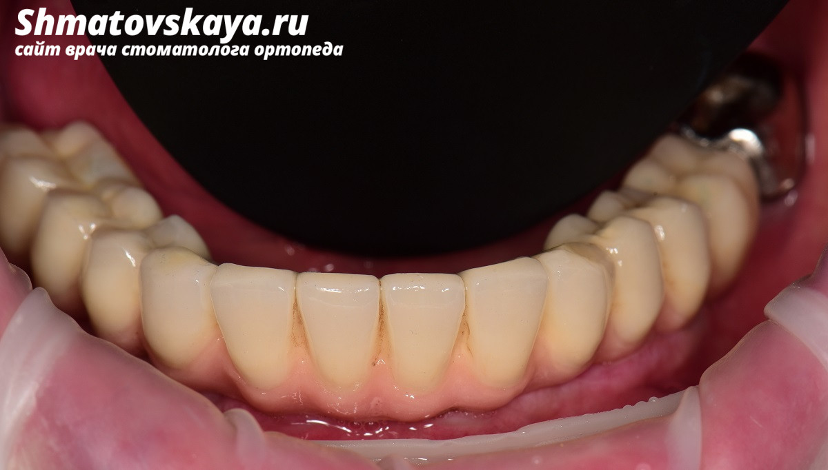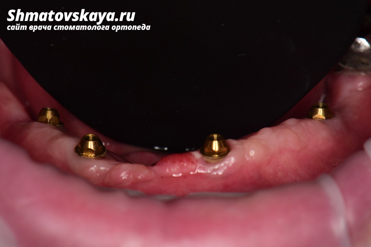 Изготовлена металлокерамическая ортопедическая конструкция на балке с опорой на 4-ре имплантата, фиксирующаяся с помощью винтов.