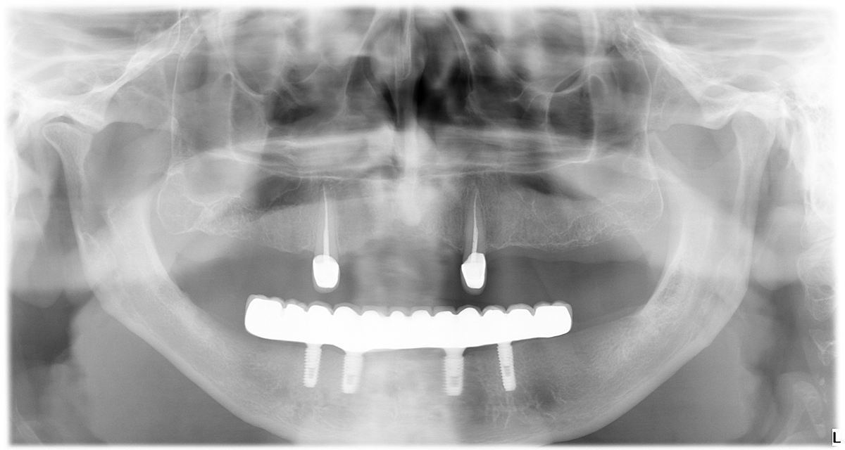 4. На нижнюю челюсть установлен металлокерамический мостовидный протез на балочной конструкции с винтовой фиксацией с опорой на на 4 мплантата.