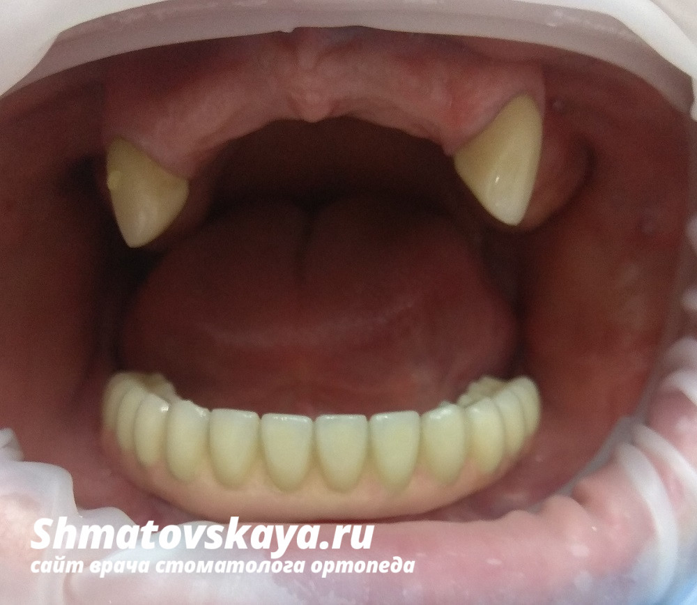 На нижней челюсти отсутствуют все зубы. На верхней челюсти имеются клыки (13 и 23 зубы). Пациент пользуется полным съёмным пластиночным протезом на нижней челюсти и частичным пластиночным протезом на верхней челюсти с кламмерной фиксацией.